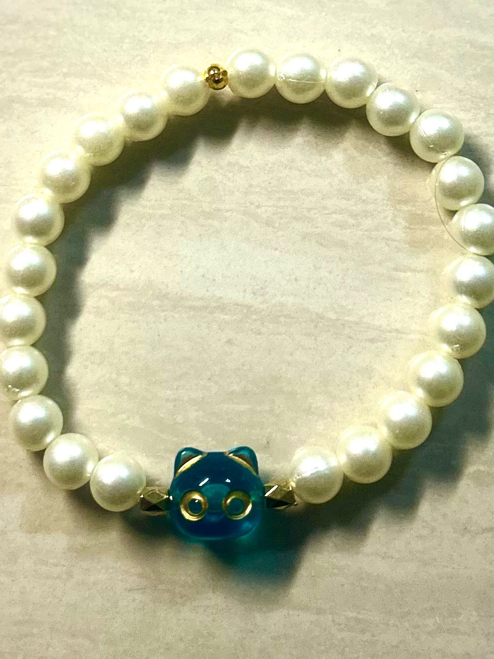 The bracelet is a stretch style, Overall, the design is playful and sweet, contrasting the classic look of the white pearl-like beads with the whimsical blue cat charm.