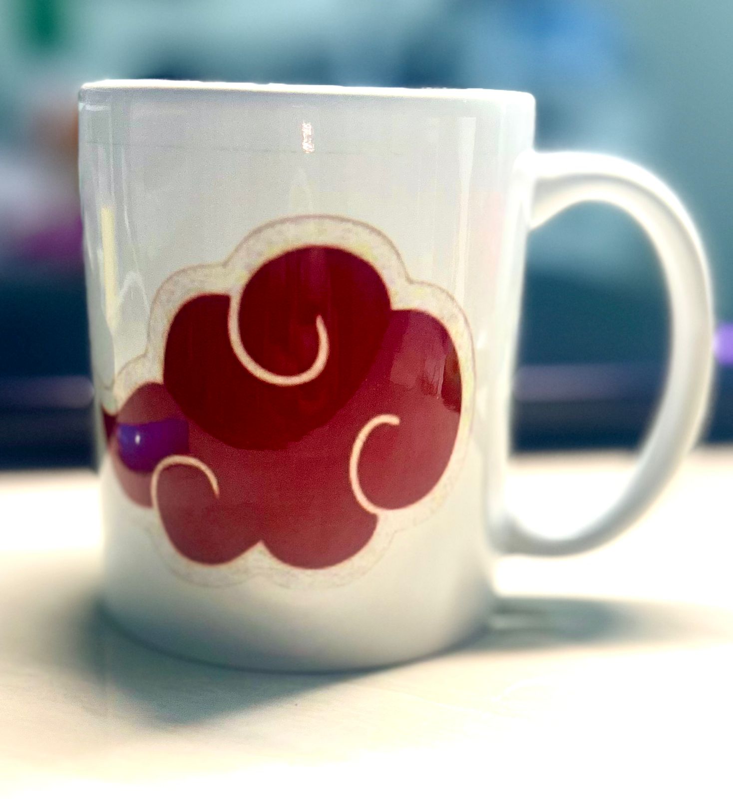 A ceramic mug which is instantly recognizable to fans of the anime and manga series Naruto as the insignia of the Akatsuki.