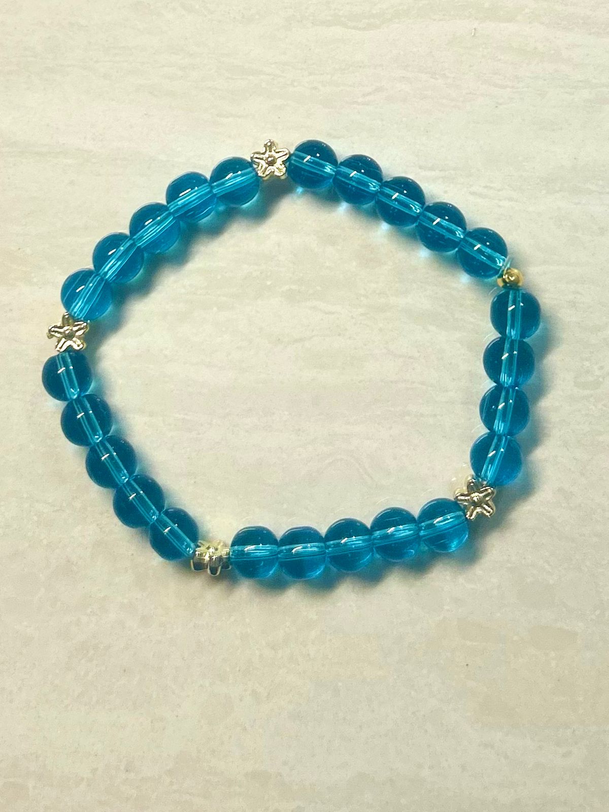 This bracelet has round glass beads that are a clear, bright aqua blue color, resembling the clear blue waters of the ocean with gold flowers.