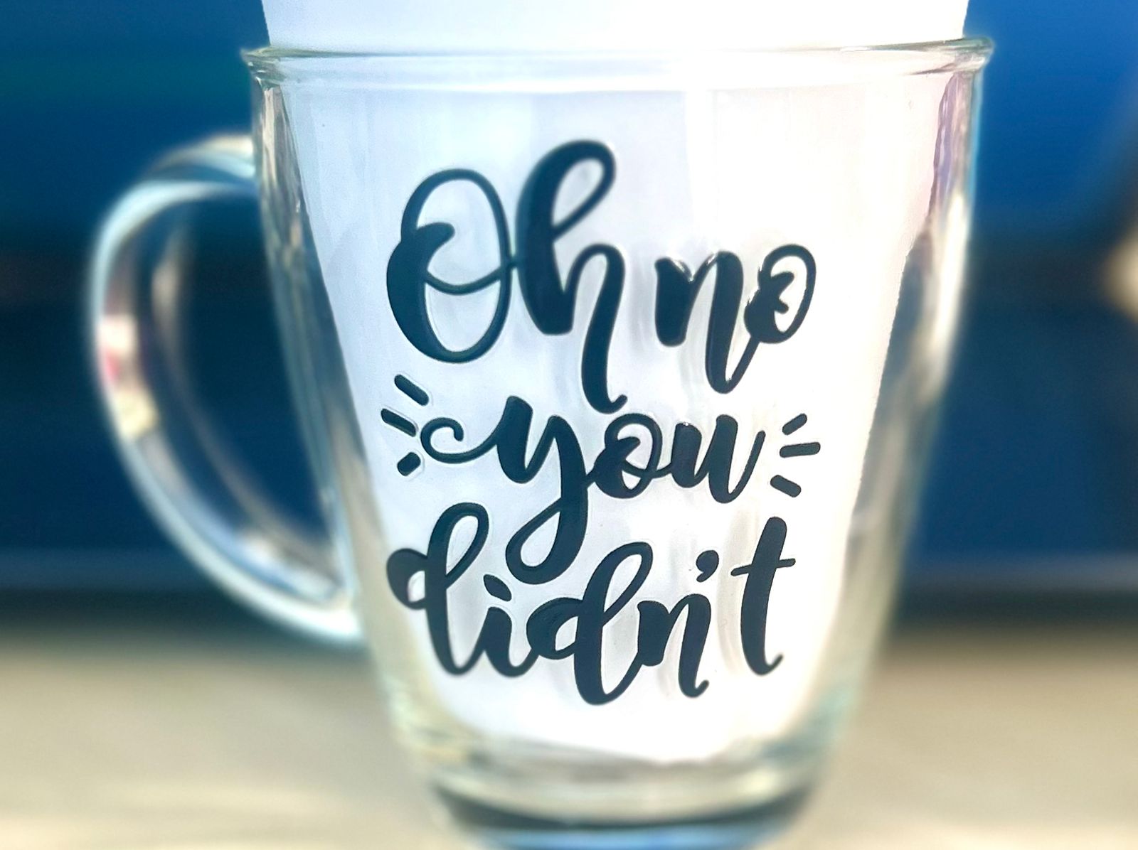 A clear glass coffee mug featuring a sassy decal. (a piece of white paper is placed inside the mug, which helps the decal stand out.) “Oh no you didn’t”, in black sassy font.