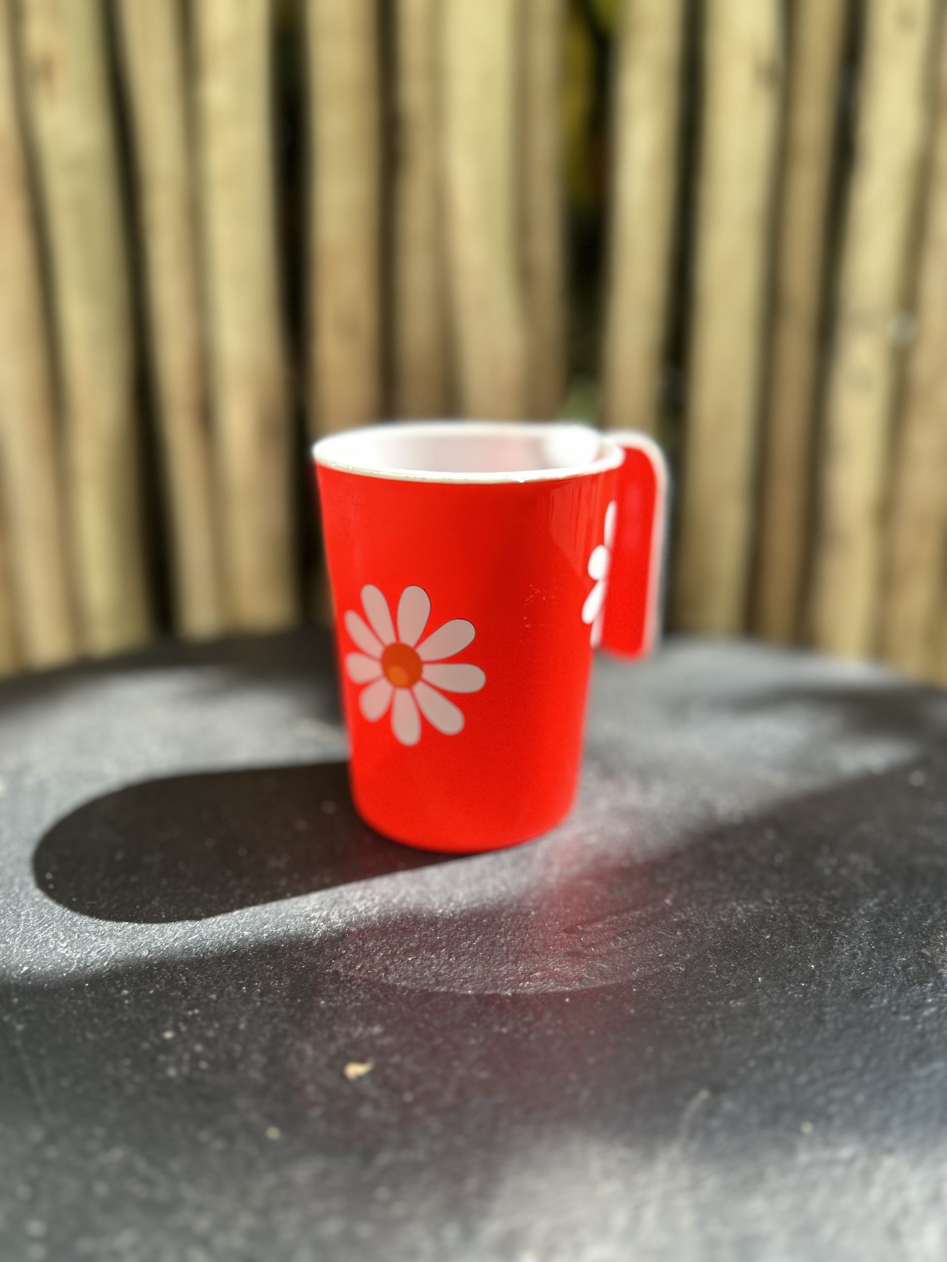 Bright red plastic, Kiddies mug with Daisey’s placed randomly around the mug.
