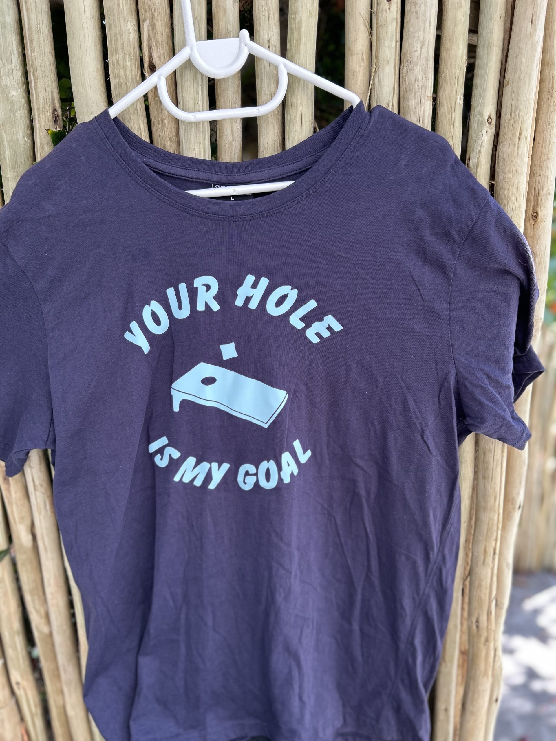 Navy blue cotton t-shirt with mint colour image “YOU’R HOLE IS MY GOAL” Catchy and toung in cheek design for the brave single men out there