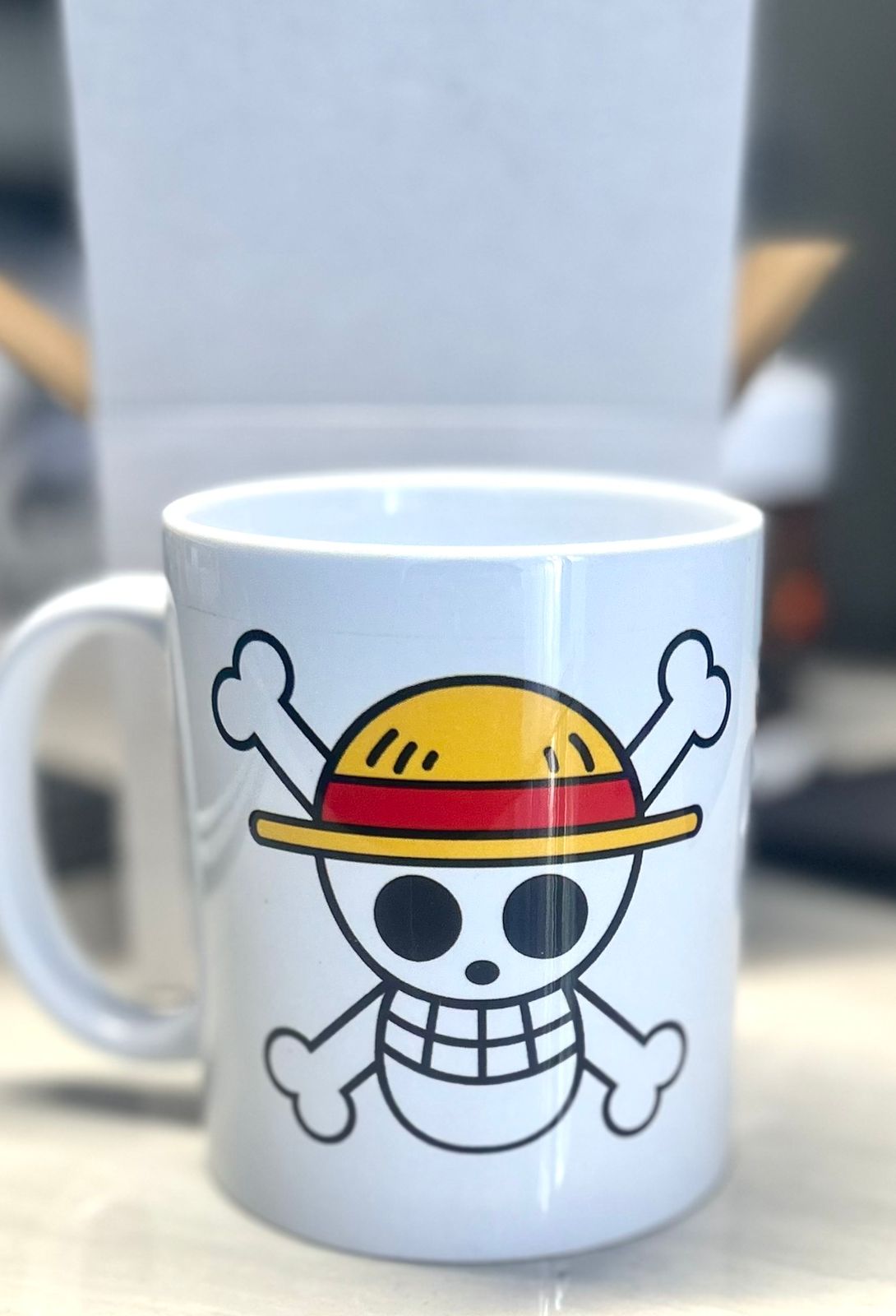 The image on this mug is the Jolly Roger (pirate flag) of the Straw Hat Pirates from the anime and manga series One Piece.