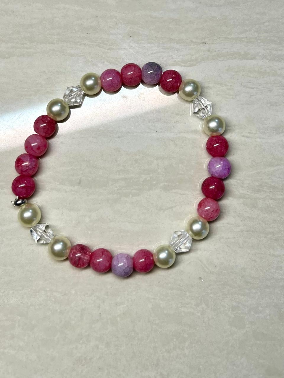 Several smooth, round beads with a creamy white that resembles pearls along with randomly placed clear crystal beads to add some sparkle.