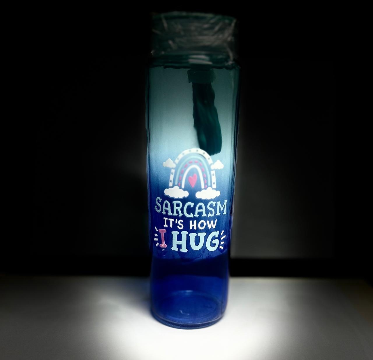 Blue glass water bottle with the text “Sarcasm is how I Hug”
